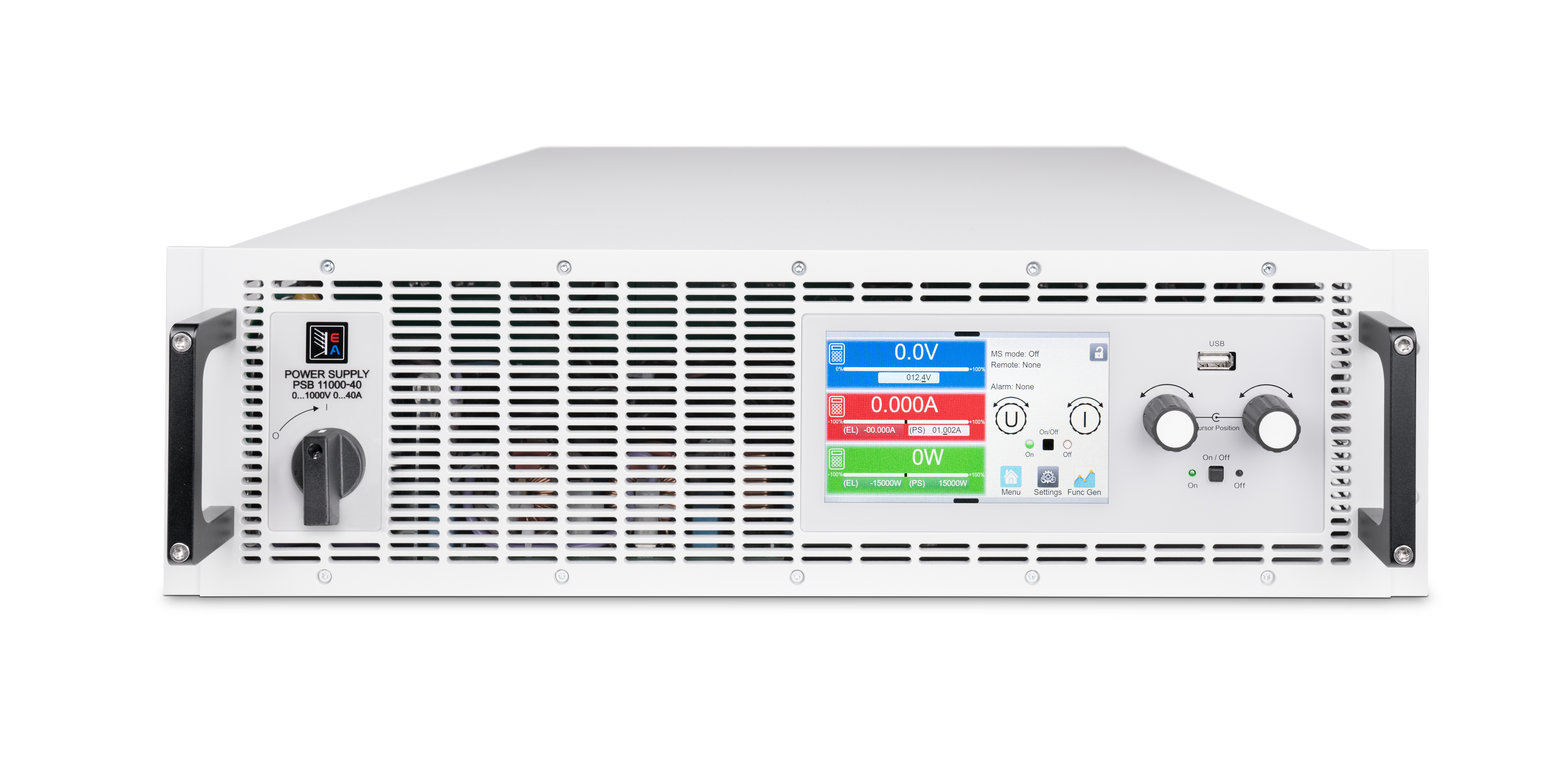 The Bidirectional DC power supply with integrated, regenerative electronic load series EA-PSB 10000 provides 15kW in 3U or 30kW in 4U chassis with up to 2000 VDC. This series easily parallels supplies for almost 1.92MW of power. All EA Elektro-Automatik DC power supplies and loads feature true autoranging and thus over additional operating ranges.
